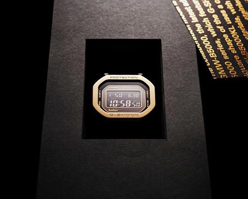 ケースとベゼルにはステンレス、バンドには樹脂といった各パーツごとに異なったテクスチャーの素材を採用。ゴールドとブラックのコンビネーションが印象的な本体の遊環と裏蓋にはコラボレーションの証として、kolorのブランドロゴとG-SHOCKの35周年ロゴが配置された。